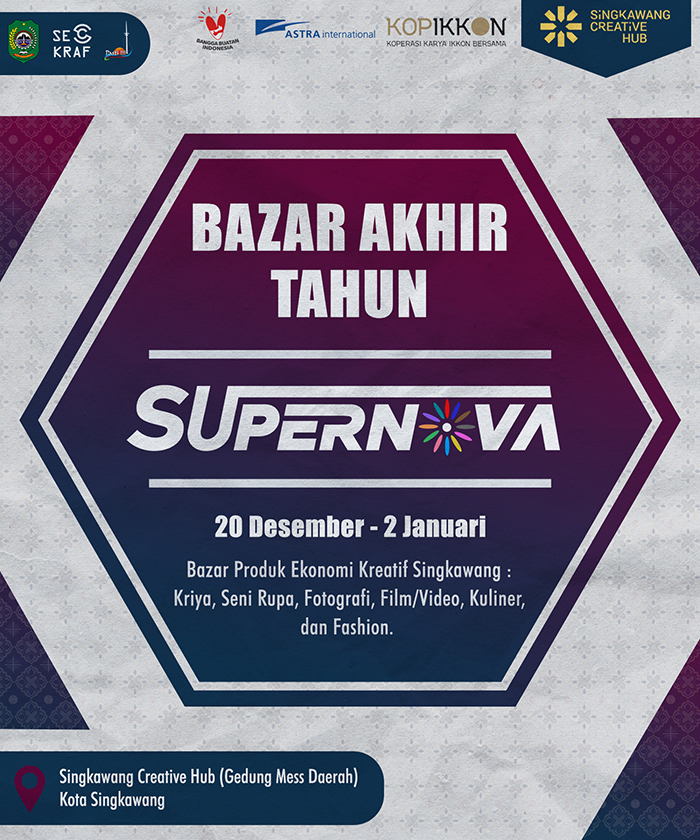 Menjelang akhir tahun 2021, Singkawang Creative Hub (SCH) mengajak pelaku ekonomi kreatif Singkawang untuk berpartisipasi dalam acara Bazar Akhir Tahun (BAT) bertajuk “SUPERNOVA”. Bazar digelar dalam rangka menutup program SCH tahun 2021, libur Natal, dan Tahun Baru.